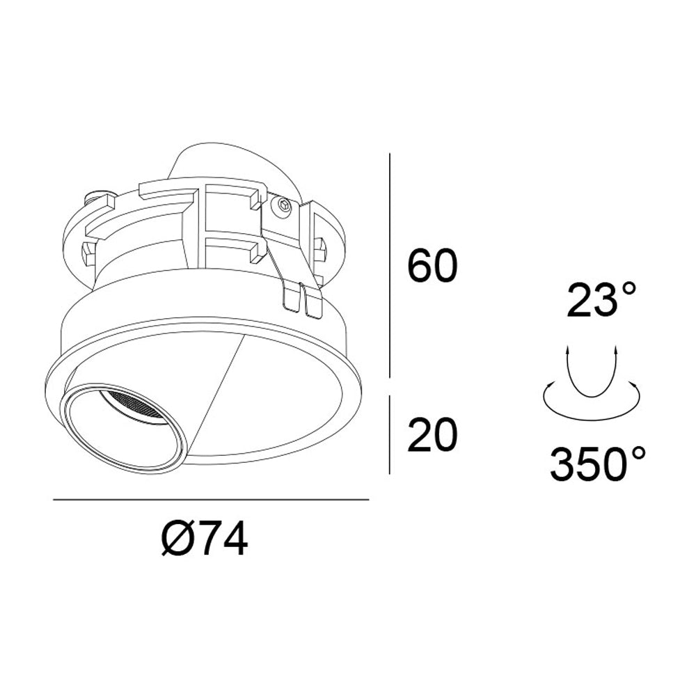 Adjustable 1*7W LED downlight. Includes 1x Non-Dimmable LED driver. Size: Ф74*62mm. IP20. Lumens: 753lm. Kelvin: 2700K. Beam angle: 36
