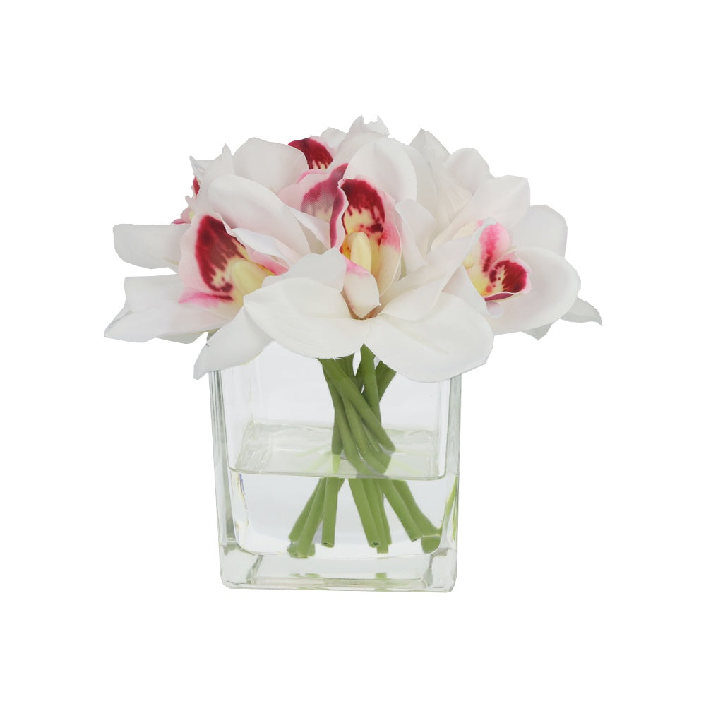 White Artificial Cymbidium Arrangement in Square Vase - Small IHR-CYM118-W-S